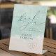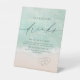 Schöne türkisfarbene abstrakte Aquarell glitzernde Ozeanwelle und Herzen im Hintergrund des Sandstrandes, mit stilvollem Drehbuch und eleganten Serif-Schriftart, modern und einfach. Große Hochzeitskennzeichen für das nautische Brautparty am Strand, tropische Hochzeit in Urlaubsort, Party zum Thema Meeresküste.