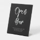 Offenes Bar Hochzeitstabletop-Schild. Eine kühne und trendige Typografie für Ihre Hochzeitsarbeit, einfach aber elegant mit einem Schwarz-Weiß-Thema. Vollständig anpassbar: Sie können bei Bedarf die Farben des Schriftartes und des Hintergrunds ändern.
