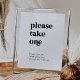 Diese moderne schwarze Typografie, bitte nehmen Sie ein Lieblings-Poster-Zeichen ist perfekt für eine einfache Hochzeit. Das minimalistisch-schwarz-weiße Design besticht durch einen Retro-zeitgenössischen Schriftart mit einem einzigartigen böhmischen Ambiente. Ideal für jede Jahreszeit. Behalt es minimal, wie es ist, oder fügen Sie Ihre eigenen Grafiken und Kunstwerke.