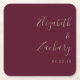 Diese einfachen, modernen Hochzeitsfavoriten sind mit goldfarbenem Untersetzer versehen, der auf einem bordeauxfarbenen Hintergrund am rechten Rand ausgerichtet ist. Fügen Sie die Namen des Paares in stilvoller Handschrift Kalligrafie hinzu.