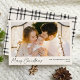 Genießen Sie den Geist der Saison mit unserer modernen Weihnachtsfotokarte, die ein schlichtes und dennoch elegantes Design bietet. Ihr horizontales Foto ist schön gerahmt in Weiß, mit "Frohe Weihnachten" in einem hübschen, handgeschriebenen schwarzen Drehbuch mit cremefarbenem Hintergrund. Personalisieren Sie es mit Ihrem Namen und dem Jahr für eine persönliche Touch. Die Rückseite der Karte verleiht dem Ganzen ein gemütliches, zeitloses Ambiente mit einem karierten, schwarzen und cremefarbenen Muster. Ideal, um Urlaubsfreuden auf minimalistische, stilvolle Weise zu teilen.