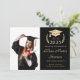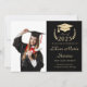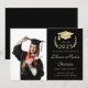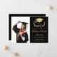 Moderne schwarze Uni-Abschluß-Anzeigenkarte in leichter Golddarstellung des Lorbeerkranzes mit Studentenoberteil, einem Foto des Absolventen und ihrem Namen in einem eleganten, hellen Goldskript.
