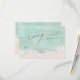 Schöne türkisfarbene abstrakte Aquarell glitzernde Ozeanwelle und Herzen im Hintergrund des Sandstrandes, mit stilvollem Drehbuch und eleganten Serif-Schriftart, modern und einfach. Große RSVP-Karten für Hochzeiten an den Wasserstränden, tropische Hochzeit in Urlaubsort, Hochzeitsfeiern zum Thema Meeresküste im Sommer.
