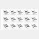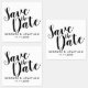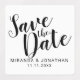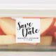 Modernes Script Save the Date Labels mit dem Titel "Save the Date" in schwarz-modernem Script-Schriftart mit Namen und Datum in modernen Sans Serif Schriftart auf weißem Hintergrund.