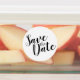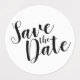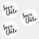 Modernes Script Save the Date Labels mit dem Titel "Save the Date" in schwarz-modernem Script-Schriftart auf weißem Hintergrund.