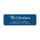 Modernes, klassisch blaues Rücksendelabel mit Ihrem Namen in einem stilvollen weißen Skript und Ihrer Adresse in einfacher weißer Typografie.