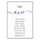 Im oberen Teil befindet sich die Tischnummer, die in einem marineblauen Schriftzeichen geschrieben ist, und oben das Wort Tabelle, in kleineren schwarzen Kappen (Handbuchstaben). Unter ihnen sind die Namen der Gäste, in ähnlichen schwarzen Handschriften.