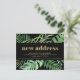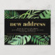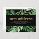 Dieser trendige tropische Adressenwechsel mit Postkarten besticht durch einen Rahmen moderner Monstera und anderer grüner tropischer Blätter mit goldenen Imitaten auf dunklem, schwarzem Hintergrund. Die Worte "neue Adresse" tauchen in trendigen, zeitgenössischen Imitaten in Goldtypografie auf. Eine einfache, aber stilvolle Ankündigung, die Sie stolz an Freunde und Familie schicken werden.