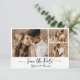 Minimalistisches elegantes, modernes Typografie-Script 3 Fotocollage Speichern Sie die Datumskarten in Schwarzweiß. Dieses romantische, zarte Design ist perfekt für moderne Hochzeiten. 3 (drei) Gitter Foto Collage, eine kursive whimsical Kalligraphie in handgeschriebenem Stil Swash Schwanz Schriftart und Liebe Herz. Einfach mit Ihren Hochzeitsdetails und Fotos personalisieren.