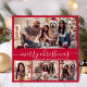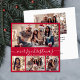 Moderne Minimalistische Elegante Calligraphie Red 5 Foto Collage Frohe Weihnachtskalligrafie Script Holiday Card. Diese festliche, mimalistische, skurrile Urlaubskartenvorlage zeigt hübsch vier (4) Foto-Collage vorne, ein Foto auf der Rückseite und sagt "Frohe Weihnachten" Grußtext, der in einer schönen Hand geschrieben ist Wirblen Swash-Schwanz-Schriftart in Weiß auf rotem Hintergrund. Auf der Rückseite mit einem Grußtext mit einem kleinen Herzdoodle auf Weiß und einer horizontalen Bildvorlage. Hübsche Grußkarte für Ihre Familie und Freunde in der Weihnachtszeit.