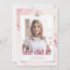 Elle L'A Fait ! | Modern Chic Typographie Graduation Invitation. Cette élégante invitation à la remise des diplômes présente un bel arrière - plan d'aquarelle abstraite rose sur une photo qui est conçue pour ressembler à un instantané vintage tout en étant élégante pour le diplômé d'aujourd'hui. Le verso comprend du texte pour personnaliser l'invitation de parti.