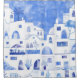 Ein blaues und weißes Aquarellbild des Dorfes Oia auf der griechischen Insel Santorin.