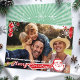 Personalisieren Sie diese Retro, Mitte des Jahrhunderts moderne Weihnachts-Fotokarte mit einem "atomisch" inspirierten Retro-Stil mit Weihnachtsschmuck, Weihnachtsmann, und "Frohe Weihnachten" auf der Vorderseite dieser flachen Fotokarte und einem farbenfrohen Muster von grünen Rochen und Schneeflocken auf der Rückseite.