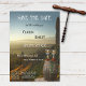 Save the Date Karte mit zwei Weingläsern mit Trauben auf einem Fass vor atemberaubendem Landschaftsbild. Wunderschön für Weinliebhaber oder eine geplante Veranstaltung in einem Weingarten oder Weinkeller.