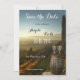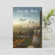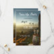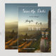Save the Date Karte mit zwei Weingläsern mit Trauben auf einem Fass vor atemberaubendem Landschaftsbild. Wunderschön für Weinliebhaber oder eine geplante Veranstaltung in einem Weingarten oder Weinkeller.