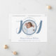 Mit dieser modernen Geburtsankündigung stellen Sie Ihren wunderschönen Neugeborenen vor. An der Vorderseite steht das Wort Freude in der stilvollen blauen Schrift Typografie und dem Foto Ihres Neugeborenen, dem vollständigen Namen, dem Ankunftsdatum und den Geburtsstatistiken. Auf der Kartenrückseite können Sie zwei zusätzliche Fotos hinzufügen.