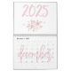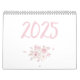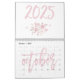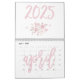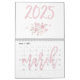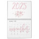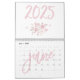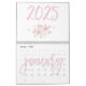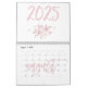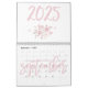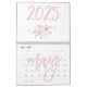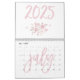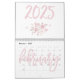Moderner Wandkalender 2025 mit wunderschönen Illustrationen von Rose und rosa Schriftzeichen, die im Kalender geschrieben sind.