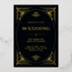 Diese glamourösen Goldfolie-Einladungen zeichnen sich durch einen modernen Look auf dem klassischen Deko aus. Ein verzierter, goldener geometrischer Rahmen und eine Verzierung schmücken einen eleganten dunkelschwarzen Hintergrund für einen dramatischen, glamourösen und Vintagen Hochzeitslook der 20er Jahre.