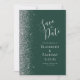 Die links Hand dieses eleganten, modernen Hochzeitsgeschehens bewahrt die Dattelkarte mit einem silbernen Imitat Glitzer Rand. Der anpassbare Text kombiniert silbergraue Handschrift, Kupferplatte und kursiv Schriftart auf einem dunkelgrünen Hintergrund. Die Rückseite ist in einem grünen und silbernen Design gehalten.