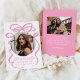 Feiern Sie mit dieser stilvollen Abschluss-Ankündigung den großen Erfolg Ihres Absolventen mit einem kühnen rosa Bogen und einem Farbband auf weißem Hintergrund. Das kreisförmige Foto des Absolventen ist vom Bogen wunderschön gerahmt, während "Graduate" in einem handgeschriebenen rosa Drehbuch glänzt. Personalisieren Sie mit dem Namen, der Schule und dem Abschluss Jahr für eine einzigartige und zeitlose Touch. Auf der Rückseite finden Sie ein zusätzliches Foto und Platz für eine individuelle Botschaft, wodurch sich dieses Design perfekt für Absolventen der Highschool und der Uni eignet. Erzählen Sie diesen Meilenstein mit einem schicken und raffinierten Sake!