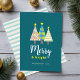 Mit dieser modernen Weihnachtskarte mit drei skurrilen Weihnachtsbäumen, überragt von hellgelben Sternen auf einem aquamarinen Hintergrund, können Sie sich Ihre Urlaubswünsche erfüllen. Jeder Baum hat ein einzigartiges Design - Retro-geometrische Drucke, bunte Polka-Punkte und Vintage Noten - und schafft so einen fröhlichen und zeitgenössischen Look. "Merry & Bright" wird in spielerischer, weißer und gelber Typografie gezeigt, mit Platz für Ihren Familiennamen und das Jahr. Ideal, um Freunden und Lieben einen festlichen Beifall zu bieten.