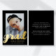Moderner Foto Abschluss Black Gold Foil Ankündigung. Personalisieren Sie es mit Ihren Fotos und dem Namen des Absolventen, Schulname und Abschluss Jahr. Ersetzen Sie den Info-Text des Grads auf der Rückseite durch Ihre Daten oder geben Sie Ihren eigenen personalisierten Text ein. Eine moderne und elegante Abschluss Foto-Anzeigenkarte mit echtem Goldfolientext. Eine tolle Möglichkeit, Ihre Highschool- oder Uni-Leistungen mit Ihrer Familie und Freunden zu teilen.