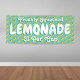 Modernes, frisch gepresstes Limonadenbanner mit einem trendigen aquamarinen Hintergrund, der in jede beliebige Farbe verändert werden kann, einer üppigen Zitrone über das gesamte Muster und einer bearbeitbaren Textvorlage, die Sie anpassen können.