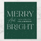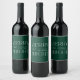 Modernes Weihnachtsweinlabel mit "Merry and Bright" in weißer Schrift und grünem Hintergrund mit subtilen weißen Punkten. Persönlich gestalten Sie das grüne Ferienweinetikett mit Ihrem persönlichen Gruß und Familiennamen in weißer Schrift.