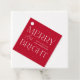 Moderne Weihnachtsmarken mit "Merry and Bright" in weißer Schrift und rotem Hintergrund mit subtilen weißen Punkten. Personalisieren Sie die roten Favoriten Tags mit Ihrem persönlichen Gruß und Familiennamen.