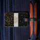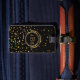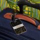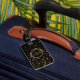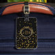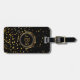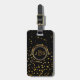 Stilvoller, Schwarzer und Goldmit Monogramm Initialenreise-Gepäckumbau. Klassische Art, Monogramm mit 3 Buchstaben Goldauf Front. Schriftartart und -farben können geändert werden. Zentriert auf Schwarzem und Imitatgoldmetallischem Blickkreis. Fester schwarzer Hintergrund mit Imitatgoldconfetti-Glitterpunkten zerstreute über die Spitze und die Unterseite. Rückseite hat den gleichen DruckImitatgoldfolie Confetti-Glitter und schwarzer Hintergrund mit DIY Textschablone, zum von Namen- und Telefonzahl oder von anderen Kontaktinformationen zu addieren. Anmerkung: Bilder werden gedruckt. Nicht tatsächlicher Glitter, Confetti oder Metall. Nobler, hoch entwickelter Gepäckanhänger.
