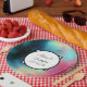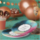 Hochzeitsveranstaltung personalisierte Papier-Teller mit einem coolen und stilvollen abstrakten Design. Wasserfarben mischen sich und mischen sich, um die Illusion eines Raumbildes zu schaffen. Grün mit lila, gelben und hellroten Wirbel und einer Mischung aus weißen Punkten und Sternen. Eine elegante künstlerische Schöpfung.