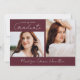 Mit dieser stilvollen, modernen Ankündigung des Foto Abschlusses verkünden Sie die Leistungen und Pläne Ihres Absolventen. Auf der Vorderseite der Ankündigung werden 2 Fotos angezeigt - 1 waagerechtes und 1 vertikales Foto. "Graduate" wird in einem trendigen, handgeschriebenen weißen Skript mit einem Hintergrund aus Maronen angezeigt. Personalisieren Sie die Ankündigung des Maroon-Abschlusses mit dem Jahr und dem Namen des Absolventen. Die Ankündigung kehrt zurück, um ein zusätzliches Foto mit Ihrem eigenen Text in weißer Schrift anzuzeigen. Diese 3 Foto Abschluss Ankündigung ist ideal für High School oder Uni-Abschlüsse.