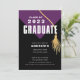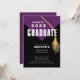 Modern & fett Klasse 2022 Graduiertenparty Einladung mit einem lila Gradcap mit Goldtassel-Set auf schwarzem Hintergrund. Besuchen Sie unseren Shop, um dieses Design in einer Vielzahl von Schulfarben zu sehen.