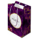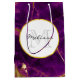 Eine Geschenktasche mit einem abstrakten Muster und einem Marmordesign. Reiche lila Farbkombinationen, kombiniert mit Imitat-Gold schwirbelnden Farbbändern, die das gesamte Design vermischen und vermischen. Ein Kreis mit einem Imitat mit goldgeflochtenem Rand, oben mit dem personalisierten Text.