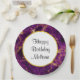 Papier Teller mit einem abstrakten Muster und Marmordesign. Reiche lila Farbkombinationen, kombiniert mit Imitat-Gold schwirbelnden Farbbändern, die das gesamte Design durchziehen. Ein Kreis mit einem Imitat mit goldgeflochtenem Rand, oben mit dem personalisierten Text.