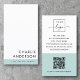 Moderne, vertikale Visitenkarten mit Ihrem Namen und Titel auf der Vorderseite und anpassbare Vorlagenfelder für Ihre Kontaktinformationen, Logo und QR-Code auf der Rückseite. Weiß und Aquablau oder Sonderfarben. Mit dem Designwerkzeug können Sie Schriftart und Farben ändern, Elemente verschieben und verändern.