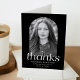Moderner Abschluss Dankeschön-Karte mit dem Foto des Absolventen gerahmt durch einen schwarzen bogenförmigen Rahmen. "Danke" wird in weißer, modernisierter Schrift dargestellt. Personalisieren Sie die Vorderseite des trendigen Abschlusses danke Ihnen Karten, indem Sie den Namen des Absolventen, den Namen der Schule und Abschluss Jahr. Im Inneren der Karte befindet sich eine typisierte oder handgeschriebene Nachricht.