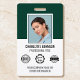 Mit diesem stilvollen Identifizierungs-Abzeichen erstellen Sie ein berufliches Aussehen. Eine einfache Vorlage, die mit Ihrem ID-Foto, Namen, Jobtitel, Firmenlogo und Akkreditierungssymbolen personalisiert ist. Die Rückgabedetails sind auf der Rückseite, zusammen mit weiteren Informationen, und einem Strichcode oder QR-Code. Passen Sie den Text an, um Ihr Unternehmen Anzug. Ideal für viele verschiedene Arbeitsorte, einschließlich Firmenfachleute, Unternehmensberater, Fachkräfte, Mediziner und vieles mehr. Druckfarben: sehr dunkelgrün, schwarz und weiß.