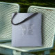 Erstellen Sie eine eigene Tasche, die mit Ihrem Vornamen in Weiß auf einem dunkelblauen Monogramm auf einem staubigen blauen Hintergrund hervorgehoben wird. Mehr Farben in unserer Sammlung.