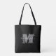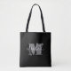 Erstellen Sie eine eigene Tasche, die mit Ihrem Vornamen in weiß über ein graues Monogramm auf schwarzem Hintergrund hervorgehoben ist. Mehr Farben in unserer Sammlung.
