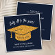 Machen Sie Ihr Party mit dieser modernen Graduiertenparty-Einladung ganz besonders. Das Design verfügt über eine kühn goldene Graduierungskappe auf marineblau-blauem Hintergrund, die dank der Designwerkzeuge leicht an Ihre Schulfarben angepasst werden kann. Aktualisieren Sie den Text vorne und hinten, sowie die Schriftart und Farben. Auch als Download verfügbar.