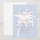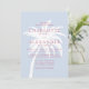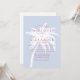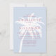 Eine stilvolle Hochzeitseinladung an der Küste mit einer fett-weißen Palmen-Silhouette vor weich blauem Hintergrund mit moderner rosa Typografie. Dieses Design, das sich perfekt für Strand, Wassersport oder Hochzeiten in Urlaubsort eignet, verbindet ein entspanntes Badeambiente mit zeitgenössischer Eleganz. Ideal für Paare, die eine schicke Hamptons inspiriert oder tropische Küstenästhesie suchen.