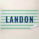 Personalisiertes Badetuch-Design mit individuellem Text in einfachen und modernen Allkapseln, die mit einem Vornamen personalisiert werden können. Navy blauer Text kontrastiert einen gestreiften, hellgrünen und weißen Hintergrund mit einem stilvollen Muster horizontaler Streifen. Farben und Schriftart-Stil können komplett angepasst werden.