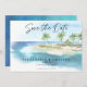 Moderne Tropical Ocean Beach Script Ankündigung Datum freihalten Hochzeitsankündigung - Verkünden Sie Ihr Hochzeitsdatum mit unserer stilvollen Aquarellenankündigung mit einer wunderschönen tropischen Strandszene. Ein warmer Sandstrand mit türkisblauem Wasser und Palmen, die mit Lichtern mit der modernen Schrift Typografie geschmückt sind. Beinhaltet QR-Code für Sie, um mit Ihrer Hochzeitswebseite anzupassen url.