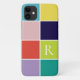 Moderne quadratische Farbe blockiert iPhone 11 Fall. Es zeigt farbenfrohe Farbblöcke in verschiedenen Farben Navy Blau, Rosa, Blau, Gelb, Aqua Blau, aquamarin, Rot, Grün, lila und Ihr Monogramm.