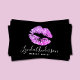 Elegantes Make-up Künstler Visitenkarte Design mit Imitaten lila Glitzer Lippen, soliden schwarzen Hintergrund und eleganten kalligraphischen Schriftart.