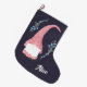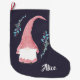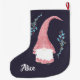 Ein niedlicher WeihnachtsStrumpf mit der modernen Version eines roten schwedischen Gnoms und einigen Blumendekorationen. Fügen Sie einen Namen mit der Vorlage hinzu. © ArianeC Illustrationen