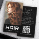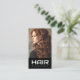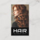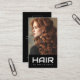 Moderne Visitenkarten mit individuellem "Friseur" in einem modernen Schriftart auf schwarzem Hintergrund mit einem Foto eines Mädchens mit hübschen Vorhängen oben.