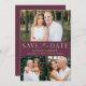 Elegantes Multi-Foto Save the Date mit "Save the Date" in weißer Schrift mit einem lila Hintergrund. Personalisieren Sie die moderne QR Save the Date-Karte mit 3 Ihrer Lieblings-Fotos, Ihren Namen, Ihrem Hochzeitstag und Ihrem Hochzeitsort. Das lila kehrt Save the Date zurück, um Ihren individuellen QR-Code mit Hochzeitswebsite und individuellem Text anzuzeigen.