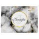 Eine personalisierte große Geschenktasche mit einem eleganten, modernen Marmormuster. Weißer, schwarzer und rauchiger grauer Marmor mit dünnen Bändern von Imitat-Gold-Wirbel im ganzen Muster. Ein weißer Kreis mit einem Imitat-Gold-Rahmen überlagert mit dem Monogramm-Initial und dem Namen im Inneren. Perfekt gepflegte Tasche für einen Bräuner Gunst.